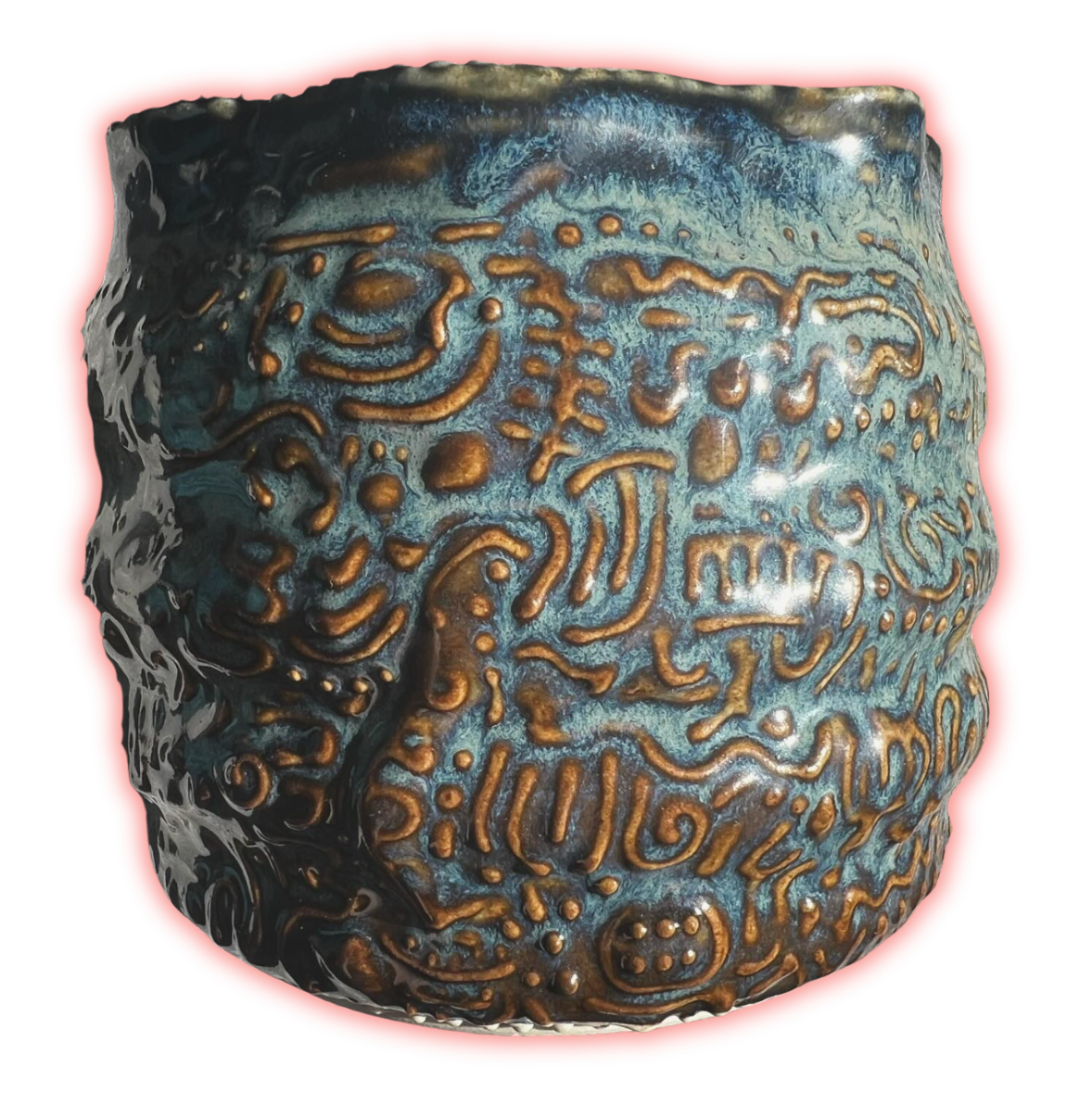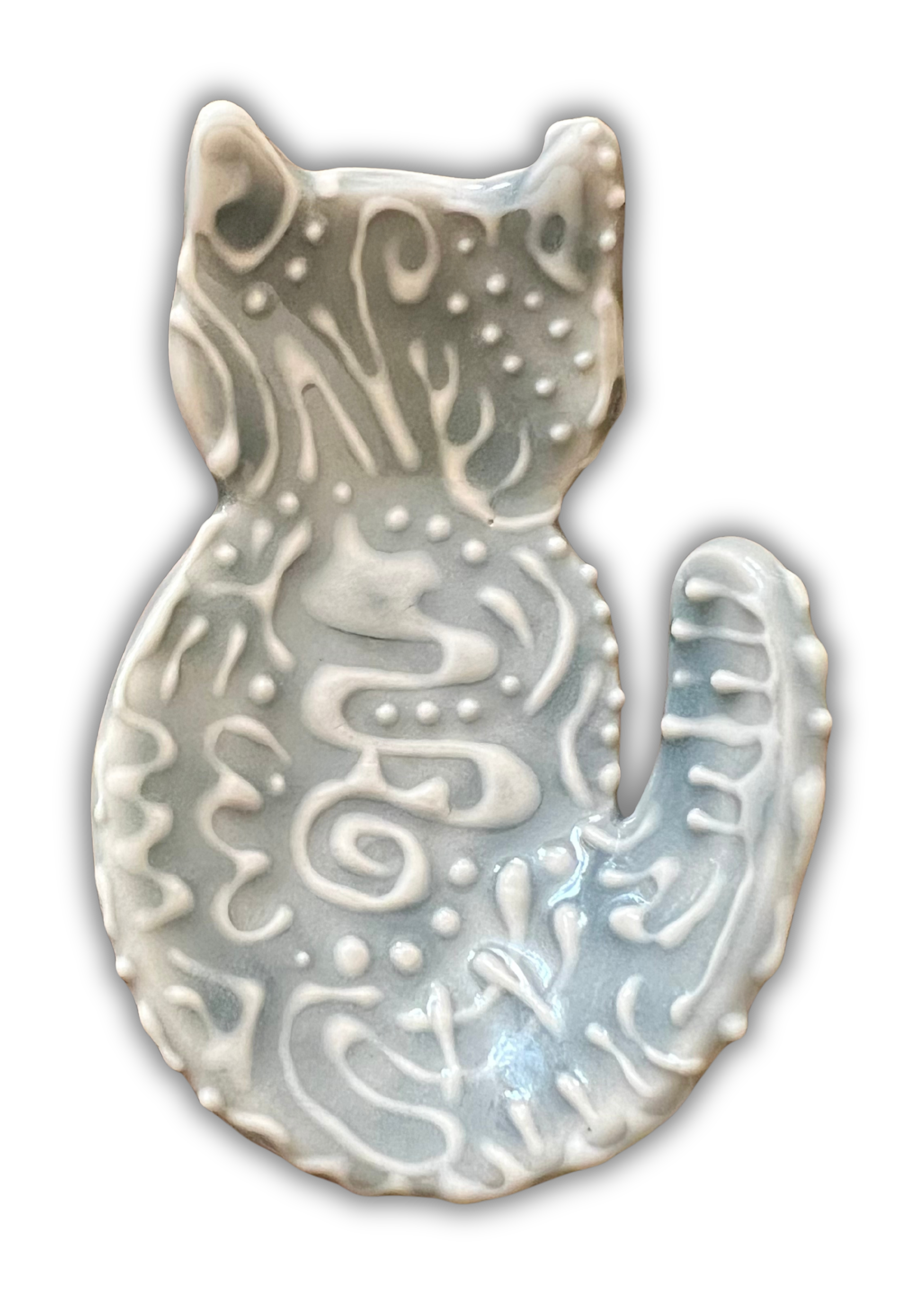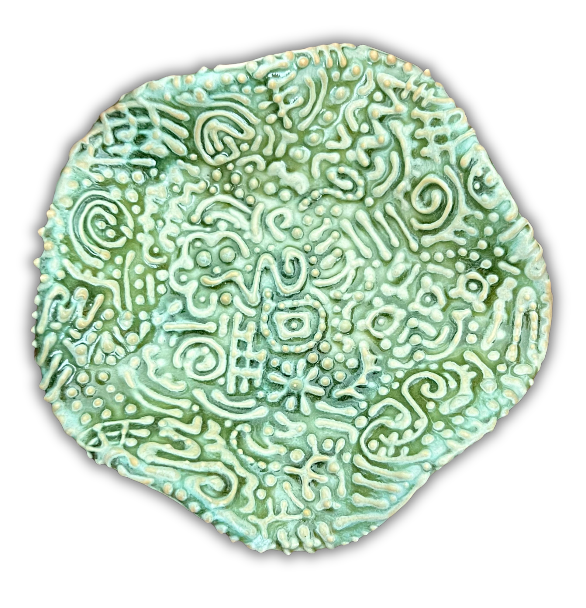 In practice, slip trailing is drawing with clay. It’s utilizing a fine nozzle to lay down controlled relief that survives firing and brilliantly catches light under the transparent glazes. It’s an additive technique (as opposed to carving/sgraffito), which keeps the surface soft to the touch while adding graphic detail. On porcelain the clean, bright ground makes those raised lines read crisp and luminous.