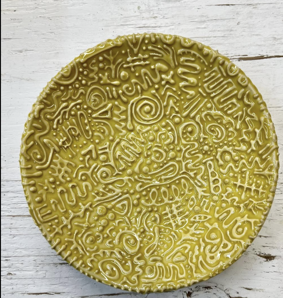 Porcelain plates alive with slip-trailed doodles—raised lines and dots you can feel. Finished in either a single glaze or a riot of color, they brighten snacks and desserts (and double as whisker-friendly cat saucers). Fired with lead-free, food-safe glazes.